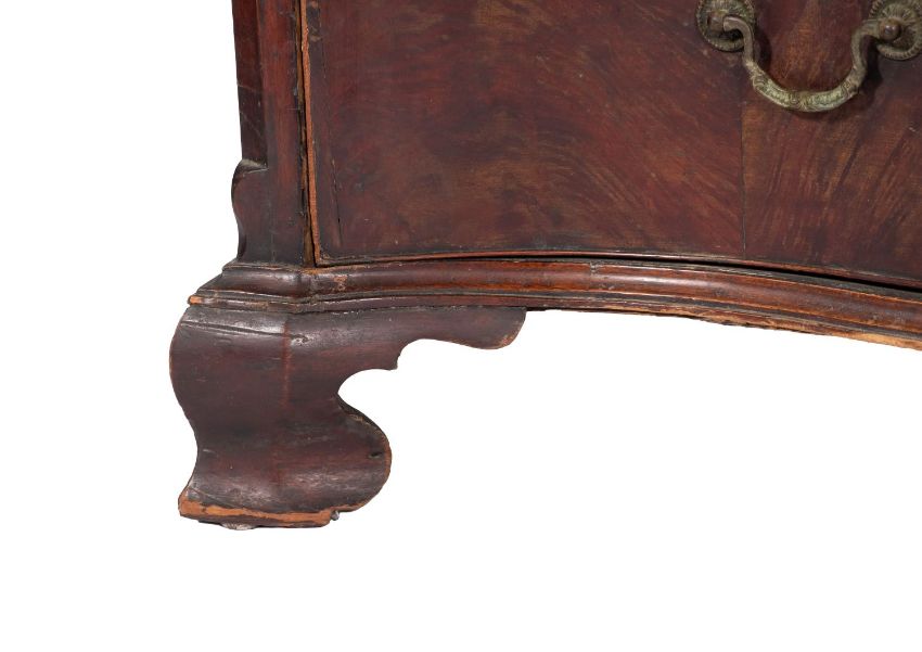 A George III mahogany serpentine front chest of drawers, last quarter 18th century; the top with moulded edges; above four graduated drawers, all with twin Rocaille cast metal swing handles and cockbeaded edges; to a moulded base with ogee bracket feet; 100cm high, 114cm wide, 58cm deep