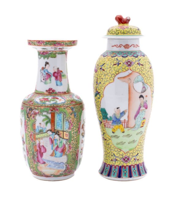 A Chinese Canton famille rose vase and a famille rose yellow ground vase and cover, late Qing/20th century the first painted with cartouches of terrace scenes, birds and butterflies on an ornate foliate ground, 23cm; the second painted with a mother and child outside a pavilion on a lotus scroll yellow ground, iron-red stencilled mark, 27cm [2].