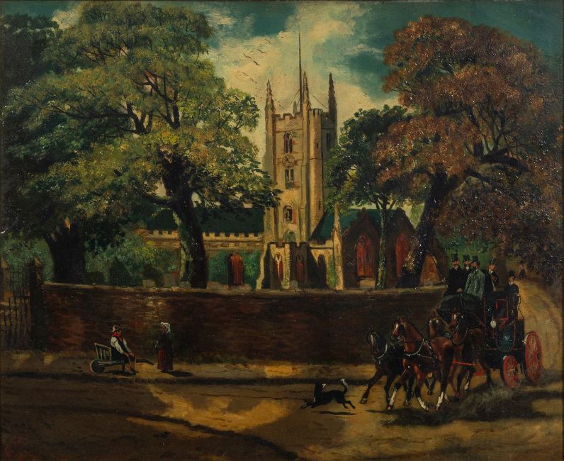 J. Howlett ? (British, 19th Century) -Horse drawn carriage passing Old Hamdsworth Church -Oil on board -45 x 55.5cm, 71 x 81cm framed -Indistinctly signed lower left, dated 83 and Inscribed on the reverse with the title and signed and dated.