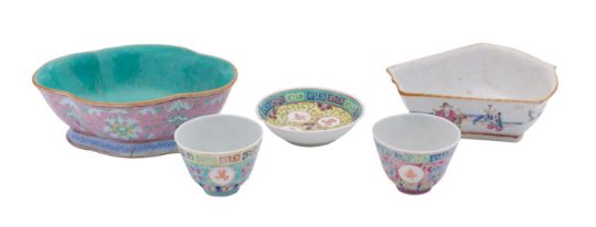 A group of Chinese famille rose and underglaze blue porcelain, Qing dynasty/20th century comprising a figural ruyi-shaped segment dish, iron-red Tongzhi mark, 16cm [rim crack]; a pink ground shaped oval 'bat and lotus' dish, iron-red Tongzhi mark, 18.5cm [cracked]; a 'dragon' rice bowl, marked 'China', 19cm; a similar saucer dish, apocryphal four-character mark, 18cm [rim crack]; and a pair of tea bowls and a saucer [damaged] 7.