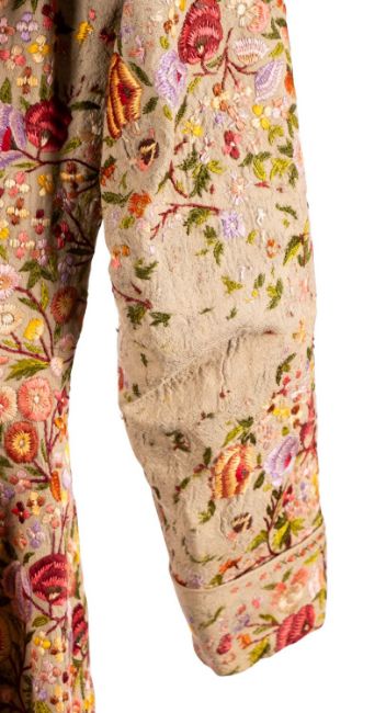 An early 20th century handmade Kashmiri floral embroidered house coat, circa 1920s with nehru collar, long sleeves and button front, the whole profusely embroidered with bordered sleeves and hem.
