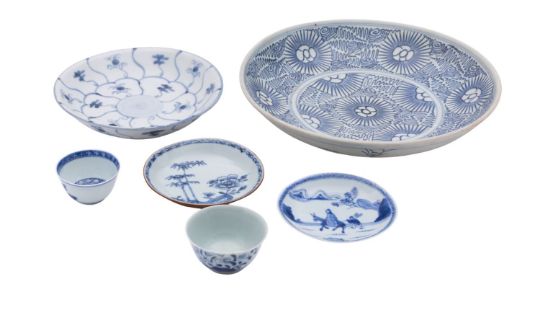 A mixed lot of Chinese blue and white 'wreck' porcelain comprising a Tek Sing saucer dish with lotus and lingzhi decoration, 18cm; a Diana Cargo Starburst dish, 28cm; a Camau Shipwreck 'Search for Plum Blossom' saucer; a Nanking Cargo café-au-lait saucer; and two teabowls [6].