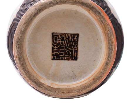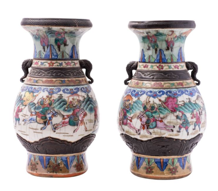 A pair of Chinese famille rose crackle-glazed vases, late Qing dynasty each with faux bronze bands and elephant head handles, enamelled with a continuous hunting scene between ruyi-head and lappet borders, apocryphal stylised seal marks, 34cm.