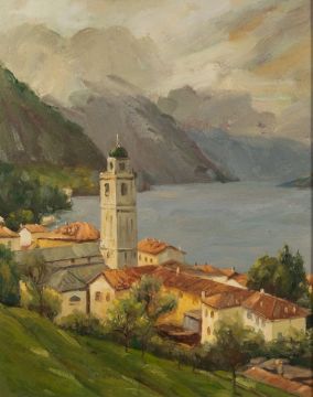 Charles Warren ?Lakeside town -Oil on canvas -49 x 39cm, 66.5 x 56.5cm framed.