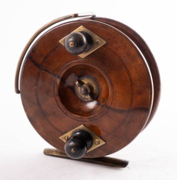 A 5 inch walnut and brass star back sea reel, with twin ebonised handles with brass fittings and foot.
