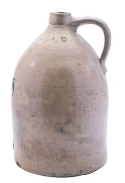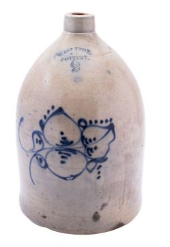 A West Troy Pottery, New York, salt glazed stoneware two gallon flagon painted in blue with a simple foliate motif, 35cm high.