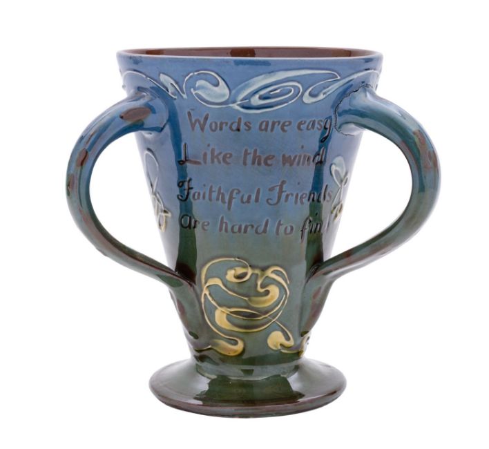 A C.H.Branham [Barnstaple] pottery tyg in the form of a three-handled loving cup, incised and slip decorated with three verses on a blue and green ground, incised marks and monogram for Frank Braddon, dated 1904, 20cm high.