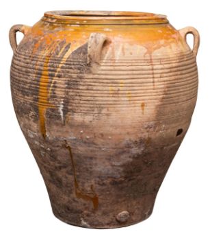 A Continental partially glazed terracotta jar, 20th century; of ribbed ovoid form, with four loop handles moulded to the shoulder, 74cm high, 67cm overall diameter