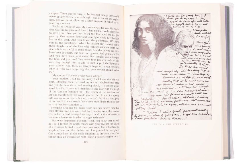PEAKE, Mervyn. Titus Groan; Gormenghast; Titus Alone; 3 vols., illustrated editions (1st thus), London: Eyre & Spottiswoode, 1968, 1968, 1970, green cloth lettered in silver to spines, neat contemp. ink ownership inscriptions to ffeps, 8vo. (3)
