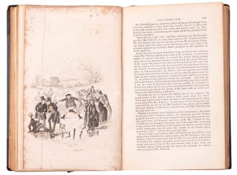 DICKENS, Charles. The Posthumous Papers of The Pickwick Club, 1st edition in book form (from the parts, no wrappers or advertisements, mixed issues), London: Chapman & Hall, 1837, engr. frontis. and engr. additional title ('Veller' to signboard), 41 engr. plates (earlier state without captions) by R. Seymour and H.K. Browne 'Phiz' (without the Buss plates), lacks half-title, browning and spotting to plates as usual, stab-holes present to inner margins of gatherings, black half-morocco over pebbled boards scuffed, backstrip detached, 8vo. [Points include: p.260 "holding" with type loose; p.341 "inde-licate", "inscription"; p.342 "S. Veller"; p.400 "this friends"; p.432 headline "F" in "OF" imperfect. (Smith, Dickens, I, 3)]