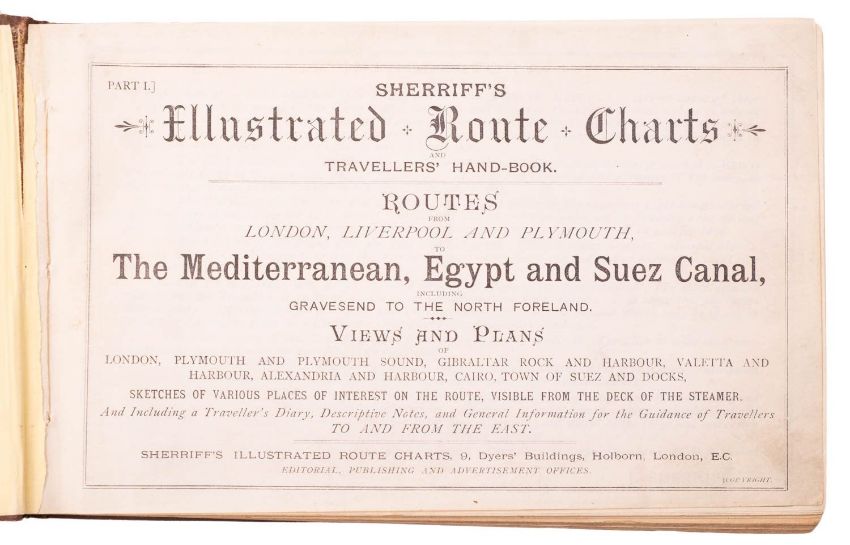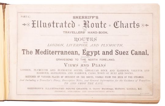 SHERRIFF, J. Sherriff's Illustrated Route Charts & Travellers Hand-book, Parts I & II, (The Mediterranean, Egypt and Suez Canal; The Red Sea, Aden, all the chief ports in India & Ceylon), London: Sherriff's Illustrated Route Charts, nd [c.1884 (intro. 1882)], 22. litho. routes, plans and views, many double-page, clean inside, text block slightly detaching, orig. pictorial brown cloth lettered in black and gilt, rubbed, oblong 8vo. Scarce.