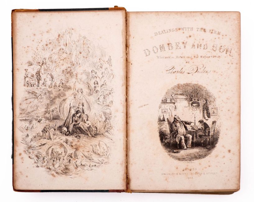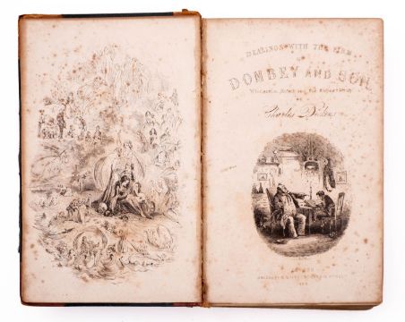 DICKENS, Charles. Dombey and Son, 1st edition in book form, 1st state, London: Bradbury and Evans, 1848, engr. frontis, engr. additional title, and 38 plates by H.K. Browne 'Phiz', half-title, errata sheet, browning and spotting to plates, several leaves loose incl. frontis., some marginal chips and tears, contemp. quarter calf distressed, backstrip torn and detached, 8vo. [Points include: No page no. to frontis., no quotation marks for the party p.xv, 'shewed and 'shew' p.40, 'Delight' p.284, 'Capatin' p.324. (Smith, Dickens, I, 8)]