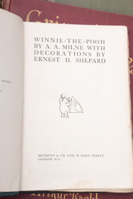 CHILDREN'S AND ILLUSTRATED. A collection of 24 vols., incl: MILNE, A. A. Winnie-The-Pooh, 1st edition, London: Methuen & Co. Ltd., 1926, illustrations by E. H. Shepard, contemp. ink ownership inscription to flyleaf, p.145/6 leaf detached with chips and edgetears and biro scribble, gatherings loose, browning to map endpapers, occasional spotting, orig. green cloth gilt, rubbed/bumped, t.e.g., 8vo; RACKHAM, Arthur (illust.). Gulliver's Travels, London & New York: J.M. Dent & E.P. Dutton, 1909, col. frontis. & plates, pictorial blue cloth stained/rubbed, lg. 8vo; IDEM. The Fairy Tales of the Brothers Grimm, London: Constable & Company Ltd., 1909, tipped-in col. frontis. & plates, pictorial red cloth gilt scuffed, 4to; DULAC, Edmund (illust.). Stories from The Arabian Nights, London: Hodder and Stoughton, 1907, tipped-in col. frontis. & plates (first several leaves detached incl. frontis. & half-title), decorative orange cloth gilt scuffed, 4to; CARSE, A. Duncan (illust.). Hans Andersen's Fairy Tales, London: Adam & Charles Black, 1912, numbered 138/250 and signed 'A.&.C. Black', tipped-in col. frontis. & plates, occasional spotting, orig. pictorial cloth rubbed/soiled, t.e.g., remainder untrimmed, 4to; ROBINSON, W. Heath (illust.). Shakespeare's Comedy of Twelfth Night or What You Will, London: Hodder & Stoughton, nd [c.1909], tipped-in col. frontis. & plates, orig green cloth gilt rubbed, 4to; and 18 others various, mixed condition. (24)*Sold with all faults.