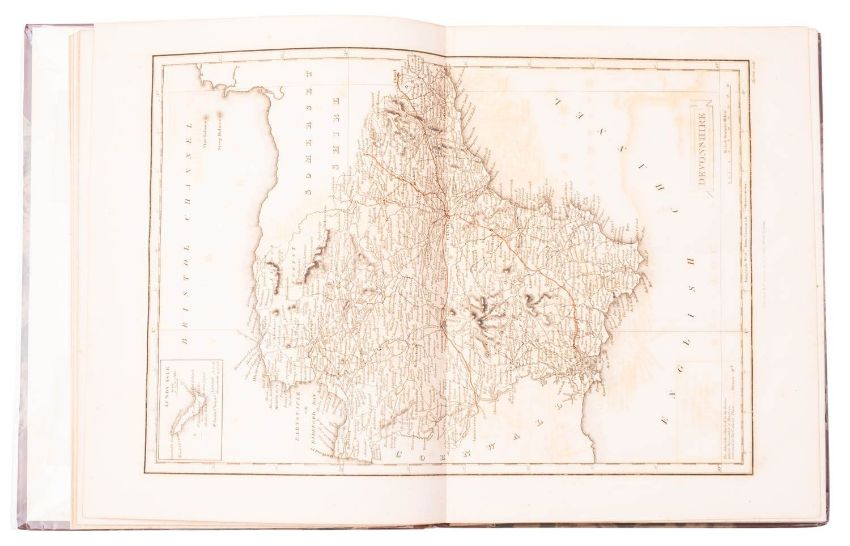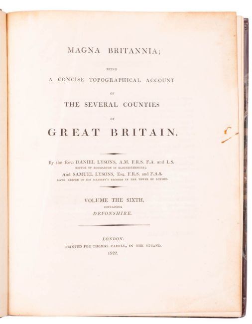 LYSONS, Daniel & Samuel. Magna Britannia... volume the sixth, containing Devonshire, 2 vols., London: Printed for Thomas Cadell, 1822, double-page map of Devon (offsetting), folding plan of Exeter, double page view of Plymouth, double page overviews of Dartmouth, Exmouth & Plymouth Havens, & 28 other plates, 1 hand-coloured, some foxing to plates and occasionally elsewhere, rebound in attractive later half-calf over marbled boards, 4to. (2)