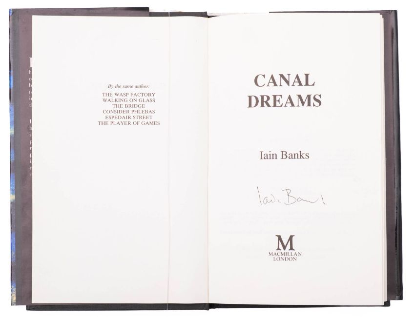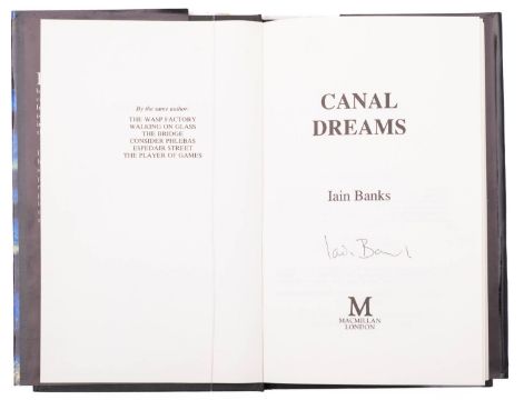 BANKS, Iain. Canal Dreams, signed 1st edition, London: Macmillan, 1989, signed to title, clean inside (top-edge spotting), dustjacket unclipped (spotting to reverse), orig. black cloth gilt lettered to spine (light bumping), 8vo.