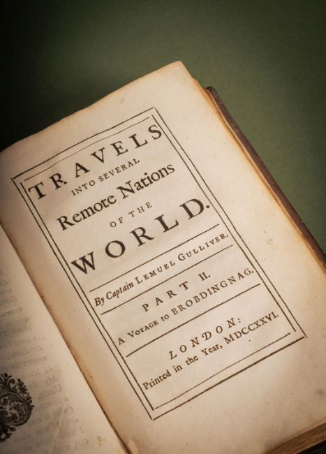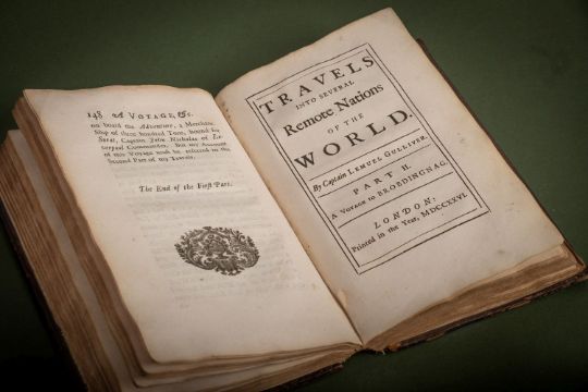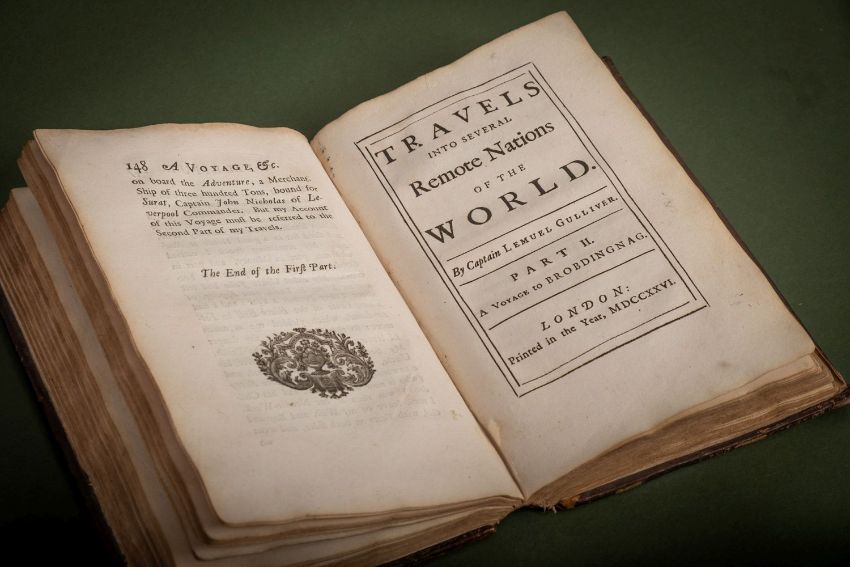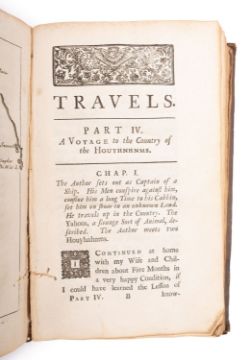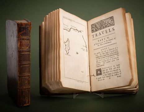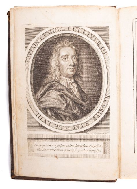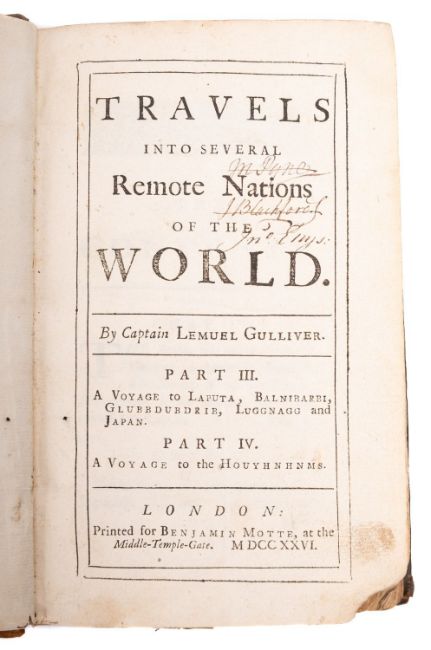 [SWIFT, Jonathan]. Travels into several Remote Nations of the World, by Lemuel Gulliver ['Gulliver's Travels'], 4 parts in 2 volumes, 1st edition, Teerink's 'A' edition, London: Benj[amin] Motte, 1726, engraved portrait frontis. (second state, vertical chainlines), 6 engraved maps and plans, woodcut initials, head & tailpieces, contemp. panelled calf (scuffed, cracking to joints), C18th & C19th ink ownership inscriptions to title pages (J[oh]n Enys, and two others struck-though), c.1cm nibbling to lower corner vol. 2 part 3 not affecting text, worm-track near spine towards tail centre vol. 2 not affecting text but affecting border of map to part 4, 8vo. (2) [First edition of Jonathan Swift's masterpiece, nigh on it's 300th anniversary; as John Gay and Alexander Pope remarked in 1726, '...universally read, from the cabinet-council to the nursery'. (Wooley, III, 48). Conforming to Teerink's 'A' small-paper points. (Teerink 289).] Provenance: John Enys, his ownership inscription; thence by descent.