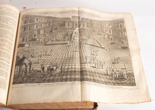 BIBLE, English. SMITH, S. The History of the Old and New Testament: or, a Family Bible..., [one vol. only, Old Testament], London: Printed by W. Rayner, 1735, engr. portrait frontis. (chipped/torn with losses to lower fore-corner), general title in red and black, 96 plates incl. maps, 6 folding, woodcut initials, some chips & edge-tears, contemp. panelled calf scuffed, cracking to joints, folio.