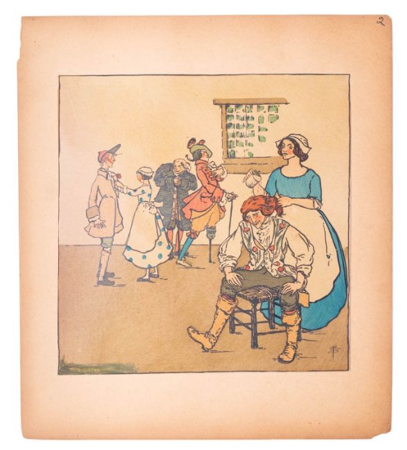 SMITH, Pamela Colman. Widicombe Fair, New York and London: Doubleday & McClure Co., 1899, numbered 401/500, onlaid pochoir colour plate to upper cover, another smaller to lower cover, 13 loose pochoir colour plates tipped-in to mounts, with leaf of sheet music, and leaf of lyrics, leaf sizes circa 23 x 23 cm, orig. maroon cloth portfolio, scuffed, 35 x 31cm.