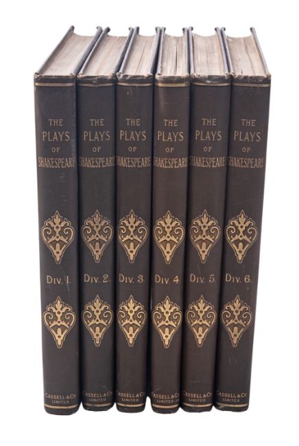SELOUS, Henry Courtney (illust.). The Plays of William Shakespeare, special edition, 6 vols., London: Cassell & Company, Limited, nd [c.1890], frontispieces, num. photogravure plates, num. woodcut plates and illustrations, generally clean inside with some splitting to endpapers along inner hinges, loose gathering in vol. 6, orig. publisher's decorative brown cloth gilt, somewhat rubbed, a.e.g., folio. A good set. (6)