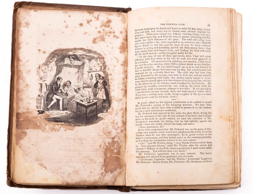 DICKENS, Charles. The Posthumous Papers of The Pickwick Club, 1st edition in book form (later state), London: Chapman & Hall, 1837, lacks half-title, lacks frontis. (p.2 plate bound as frontis.), with engr. additional title ('Weller'), 40 engr. plates by R. Seymour and H.K. Browne 'Phiz' (without the Buss plates and lacks p.268 plate, others misbound), heavy browning and spotting to plates, some plates and leaves with tears, repairs, and losses, occasional chips/tears/repairs elsewhere, loose leaves, ink ownership inscription to title, some pencil annotations, contemp. cloth with old reback distressed, 8vo. *Sold with all faults and not subject to return.