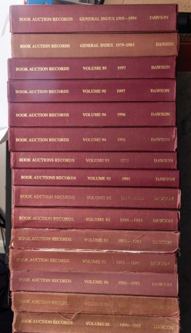 BOOK AUCTION RECORDS. Volumes 72-77, 79-82, 85-95, and general indexes for 1979-1984 and 1989-1994, 30 vols. (a broken run for years 1974/5 to 1997 including several duplicates), Folkestone: Dawson, orig. red publishers cloth, mixed condition, 4to. (30)