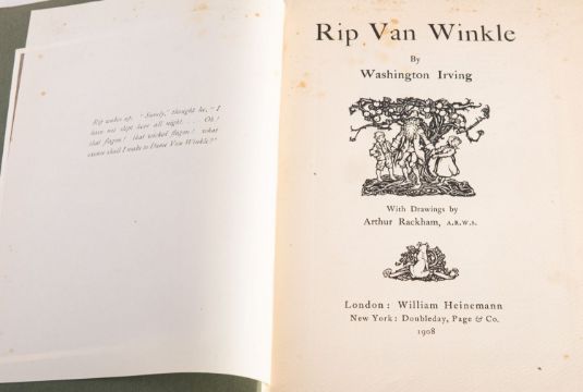 ILLUSTRATED & LITERATURE. RACKHAM, Arthur (illust.). Rip Van Winkle by Washington Irvine, London, William Heinemann, 1908, 4th impression, tipped-in colour frontis. & plates, some spotting, orig. pictorial green cloth gilt, scuffed/bumped, 4to; with... DEALY, Jane M. (illust.). Little Pickle, by F. E. Weatherly, London: Hildesheimer and Faulkner, nd, col. illustrations, orig. pictorial cloth-backed boards, slim 16mo; together with... THOMSON, James. The Seasons and Castle of Indolence, London: for F. C. & I. Rivington, 1821, engr. frontis., contemp. panelled calf gilt, 24mo; and two other vols. various. (5)*Sold as a group with all faults.