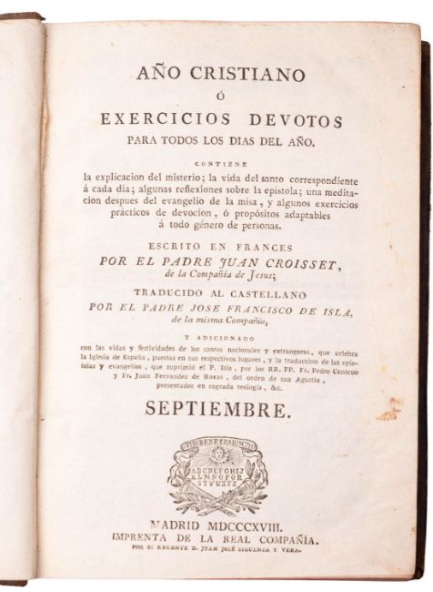 CROISSET, Juan and ISLA, José Francisco de (transl.). Año Cristiano o Exercicios Devotos para Todos los Días del Año, 11 vols. (of 12, lacks May/Mayo), Madrid: Imprenta De La Compañía, 1818, half-titles, titles, contemp. Spanish mottled morocco, very scuffed, insect damage and chipping to some spines, one upper cover heavily worn, 8vo.