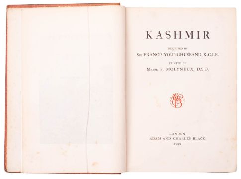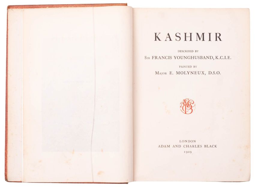 INDIA. YOUNGHUSBAND, Francis. Kashmir, 1st edition, London: Adam and Charles Black, 1909, col. frontis. and plates, captioned tissue guards, folding map at rear, some foxing, half-title partially detached, W.H.Smith library label to fep, brown cloth scuffed, 8vo; MENPES, Mortimer. India, 2nd edition, ibid, 1912, col. frontis. and plates, captioned tissue guards, browning & spotting in parts, orig. decorative red cloth gilt, rubbed/bumped, 8vo. (2)