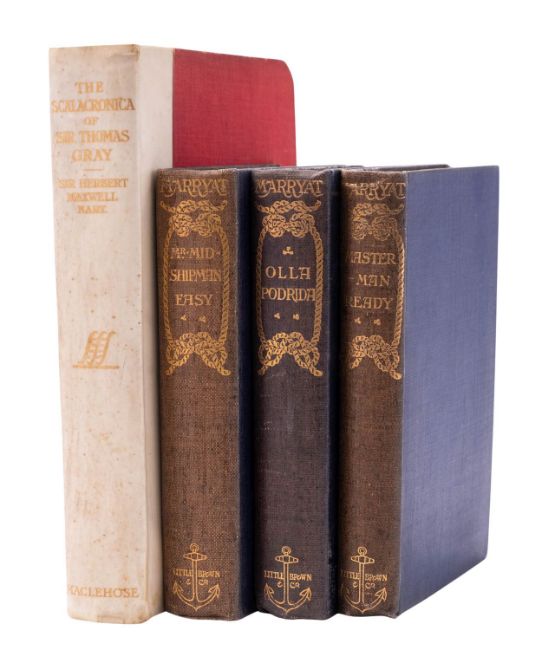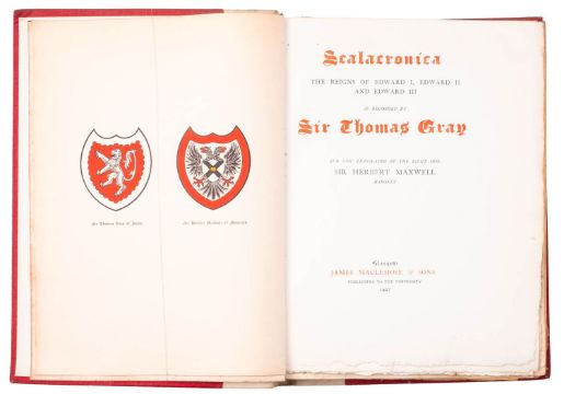 MAXWELL, Herbert (transl.). Scalacronica ... as recorded by Sir Thomas Gray, Glasgow: James Maclehose & Sons, 1907, numbered 28/95, col. frontis with arms, tile in red and black, 18 col. plates, (some browning and spotting), orig. quarter vellum over red cloth (bumped, soiling/spotting), 4to; together with... JOHNSON, R. Brimley (ed.). The Novels of Captain Marryat, 3 vols. (only), Mr Midshipman Easy, Masterman Ready, Olla Podrida, London: J M. Dent and Co', 1896, ea. numbered 535/750, blue cloth, 8vo. (4)