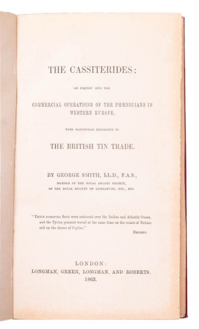 SMITH, George. The Cassiterides: An inquiry into the commercial operations of the Phoenicians in Western Europe, with particular reference to The British Tin Trade, 1st edition, London: Longman, Green, Longman and Roberts, 1863, ink ownership inscription verso to ffep, orig. blind-panelled gilt-lettered red cloth slightly bumped/tanned, 8vo.