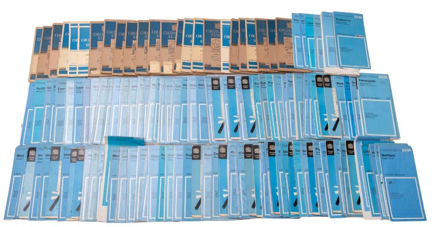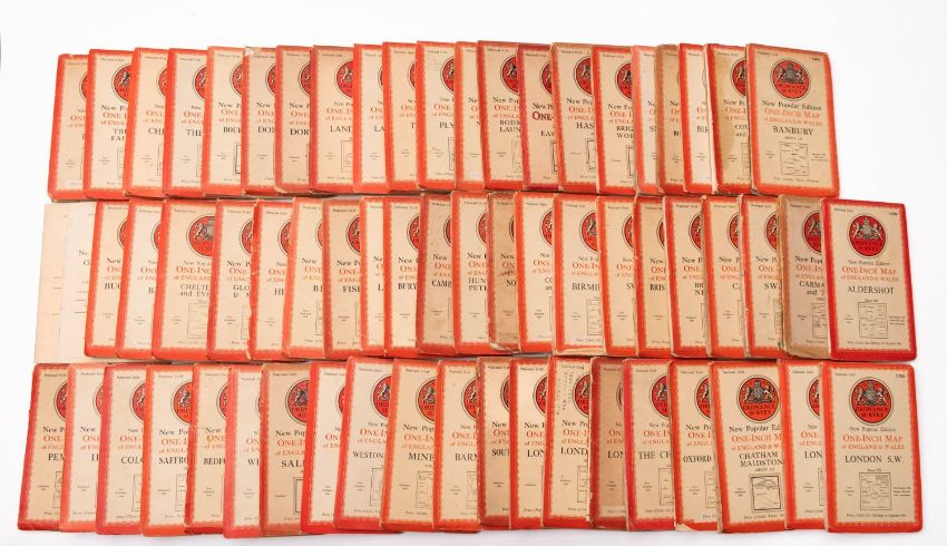 ORDNANCE SURVEY, including STANFORD, Edward (pub.). An extensive collection of Ordnance Survey maps, C19th-C20th, including Edward Stanford editions, War Revision, Large Sheet 1-inch & 1/2-inch, Coloured Edition 1-inch, Contoured Road Maps 1-inch, Road 1/2-inch, Popular Edition 1-inch, New Popular Edition 1-inch, 7th series, and assorted others, Scotland, England, Wales, and N.Ireland, with other Ordnance Survey publications. (approx. 1100)[Including Edward Stanford (pub.). Sheets 314, 315, 316, 329, 330, in blue & white marbled boards with slipcase; sheets 212, 239, 240, 254, 255, 256, 258, 270, 272, 273, 277, 278, 286, 287, 288, 289, 292, 293, 294, 304, 305, 320, 321, 329, in blue & white marbled boards; sheets 142, 143, 156, 157 in burgundy marbled boards with slipcase; sheets 255, 271, 303, & Maidenhead, in burgundy marbled boards; OS Contoured Road Map 'Bridges' Patent Mounting' sheets 113, 114, 116, 117, 118, 121, 122, 126, 129, 130, 132; and others.]