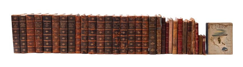 BINDINGS, MISCELLANEOUS. The Daily Telegraph Library, 17 vols. from 'The 100 Best Novels', London: The Daily Telegraph, nd [c.1900], uniform black pebbled half-calf over pale marbled boards, scuffed, t.e.g., 8vo; with... WEBSTER, Noah et al., An American Dictionary of the English Language, Springfield: George and Charles Merriam, 1861, portrait frontis., contemp. blindstamped calf distressed, 4to; together with... 13 other miscellaneous vols., and 2 miniature vols., C18th-C20th, variously bound, mixed condition. (33)