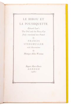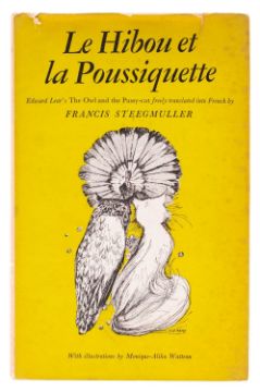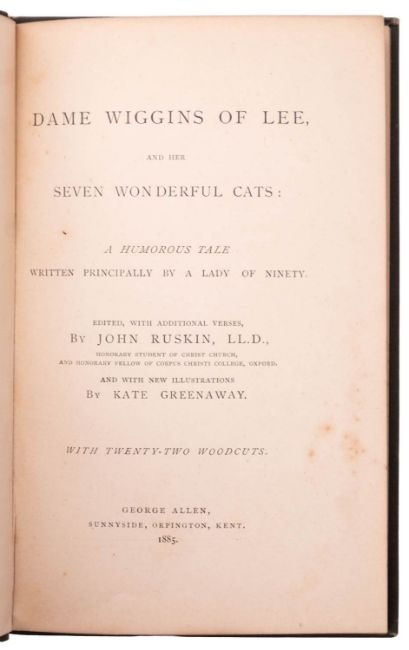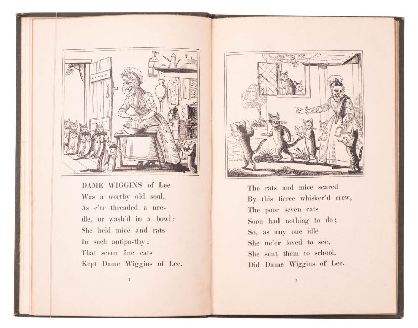 ILLUSTRATED, CATS. GREENAWAY, Kate (illust.). Dame Wiggins of Lee, and her Seven Wonderful Cats..., Orpington: George Allen 1885, woodcut illustrations, some spotting, orig. green pictorial cloth gilt (rubbed), slim 8vo; WATTEAU, Monique-Alika (illust.). Le Hibou et la Poussiquette, London: Rupert Hart-Davis 1961, 10 plates, some spotting, orig. cream pictorial boards gilt, dj (chipping, spotting), 8vo. (2)