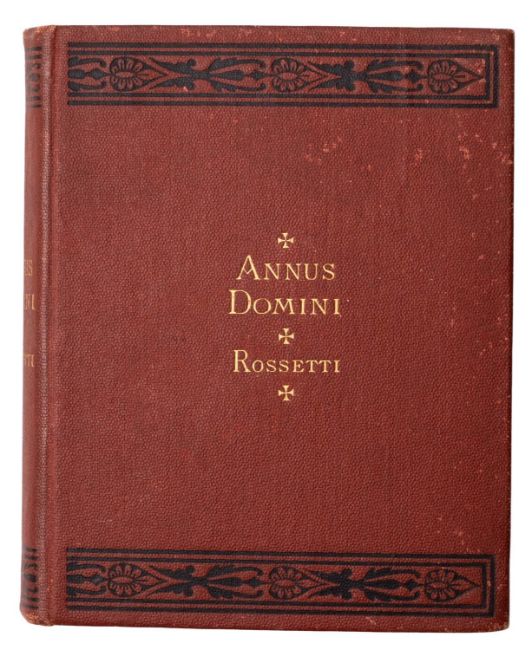 ROSSETTI, Christina. Annus Domini: A Prayer for each Day of the Year, Founded on a Text of Holy Scripture, London: James Parker and Co., 1875, advertisements at rear, contemp. ink gift inscriptions to flyleaf, pressed flower sewn into p.viii, devotional card of St. Rosalia tipped-in to ffep, orig. red-brown cloth, rubbed, a.e.red, 18mo. [Scarce.]