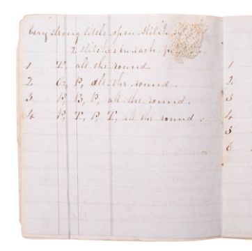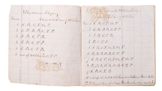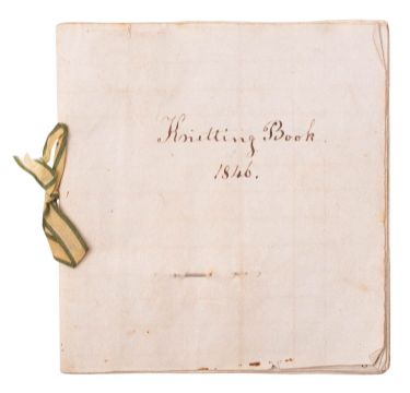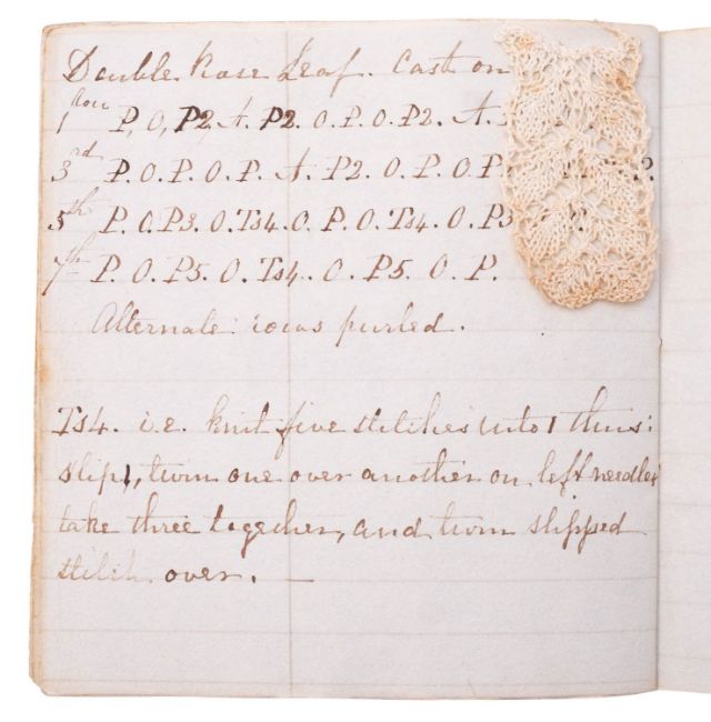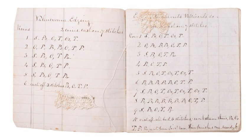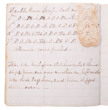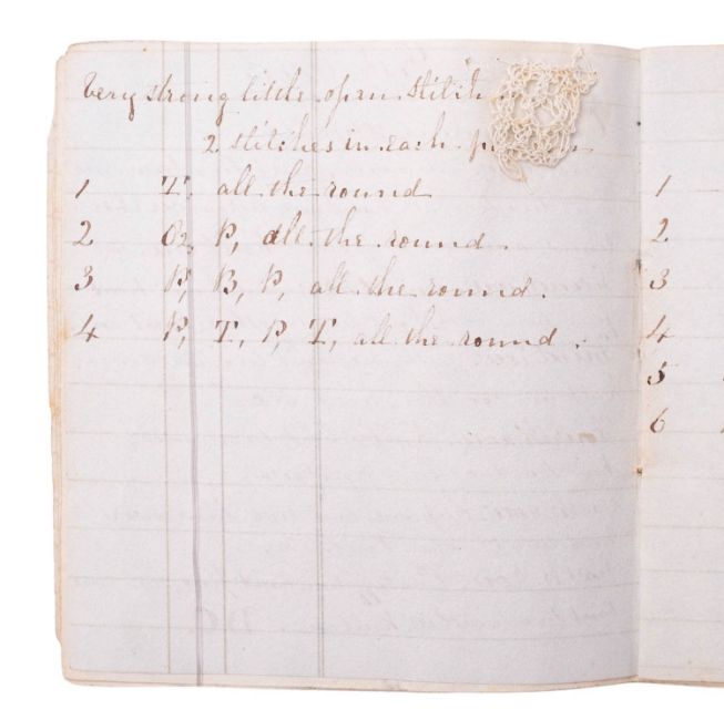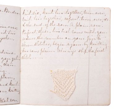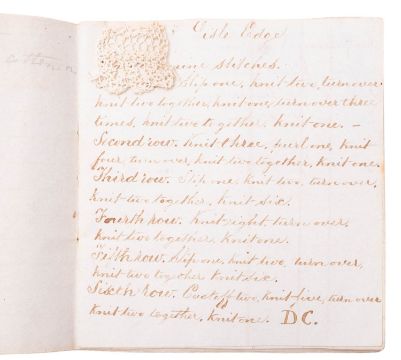 NEEDLEWORK. Knitting Book, 1846. Manuscript on paper, 22pp. of needlework instructions and stitch sequences, in ink in a neat hand, on 16 leaves of ruled paper, ribbon-tied, with 6 mounted samples in fine white cotton thread, including Valencienne Edging, Lisle Edge, and others, 11 x 10cm.
