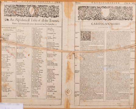 CARDIGANSHIRE. SPEED, John. Cardigan Shyre described, John Sudbury & George Humbell, 1610 [1611 or later], hand-coloured engraved map from The Theatre of the Empire of Great Britaine, inset town plan of Cardigan, compass rose, mileage scale, title and arms within strapwork cartouches, English text verso with historiated initial, framed and double-glazed, repairs to centre-crease verso, some spotting and staining, 40.5cm x 51cm.