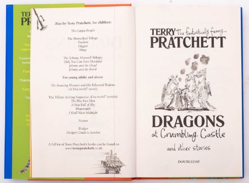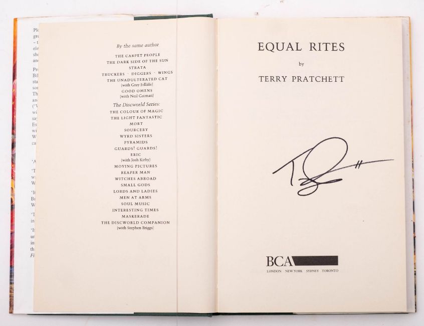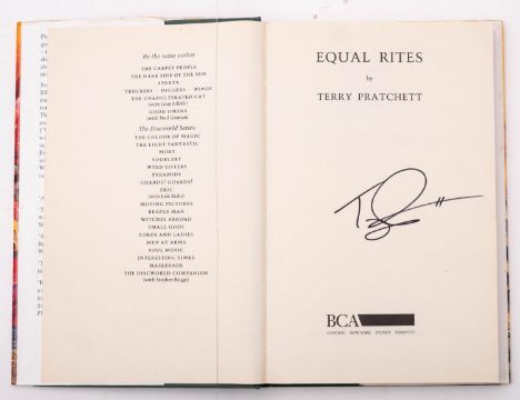 PRATCHETT, Terry. Eric, A Discworld Story, 1st edition, London: Victor Gollancz Ltd., 1990, illustrated by Josh Kirby, clean inside, dustjacket (clipped, small tears to several folds), orig. black cloth gilt lettered to spine, (light bumping), 4to; together with... IDEM. Signed later editions of: The Carpet People, London: Doubleday, 1992, dj, cloth, 8vo; Equal Rites, London: BCA, 1996, dj, cloth, 8vo; Mort, London, Victor Gollancz, 1991, stamp to ffep, dj, cloth, 8vo; Once More With Footnotes, Framington: The NESFA Press, 2005, dj, cloth, 8vo; ...with a copy of IDEM. Dragons at Crumbling Castle, London: Doubleday, 2014, dj, orig pictorial boards, 8vo. (6)