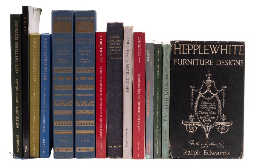FURNITURE, REFERENCE. MONTGOMERY, Charles F. American Furniture The Federal Pariod..., 2 copies., London: Thames and Hudson, 1967, num. illustrations, ownership inscription to ffep of one copy, orig. blue cloth gilt rubbed, lg. 4to; STRANGE, Thomas Arthur. English Furniture Decoration Woodwork and Allied Arts, London: B.T. Batsford, 1950, 5th imp., foxing to endpapers, blue cloth gilt scuffed, 4to; HEPPLEWHITE. Furniture Designs, London: A. Tiranti, 1947, foxing to endpapers, black cloth, dj (chipped/spotted), 8vo; RONALD PHILLIPS LTD (pub.). Antique English Furniture, annual catalogues for 2002, 2003, 2004, orig. cloth rubbed, 4to; together with 6 other furniture related catalogues/publications (pbks), and one other vol. (14)