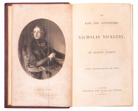 DICKENS, Charles. The Life and Adventures of Nicholas Nickleby, 1st edition in book form (intermediate state, extra-illustrated), London: Chapman and Hall, 1839, engr. portrait frontis. by Findan after Maclise, 39 engr. plates by H.K. Browne 'Phiz' (publisher's imprint to frontis. only), extra-illustrated with 8 engr. caricature plates by Joseph Kenny Meadows, lacking half-title, browning and spotting to orig. plates as usual, some off-setting, blind-panelled maroon morocco scuffed, a.e.g., 8vo. [Points include: p.160 "latter"; p.245 "flys"; p.272 "visiters"; p.297 "incontestible"; p.586 "suprise". (Smith, Dickens, I, 5)]