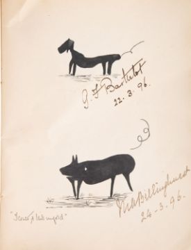 AUTOGRAPH ALBUM, 'PIGS', late C19th. 'Pig' themed manuscript visitors book or album amicorum, the upper cover signed 'Beatrice M. Bradley', circa 70 pp. of signed and dated pen and ink drawings of pigs, 1895-1901, a little spotting and chipping primarily to covers, 23cm x 18cm.