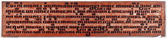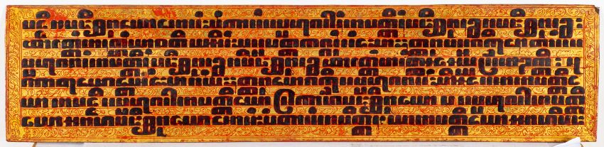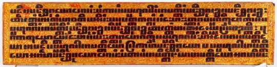 A set of eight Burmese Kammavaca Buddhist manuscript leaves, late 19th/early 20th century each lacquered in red, black and gilt with square script relating to monastic life and ordination, 55 x 13cm [minor damage].