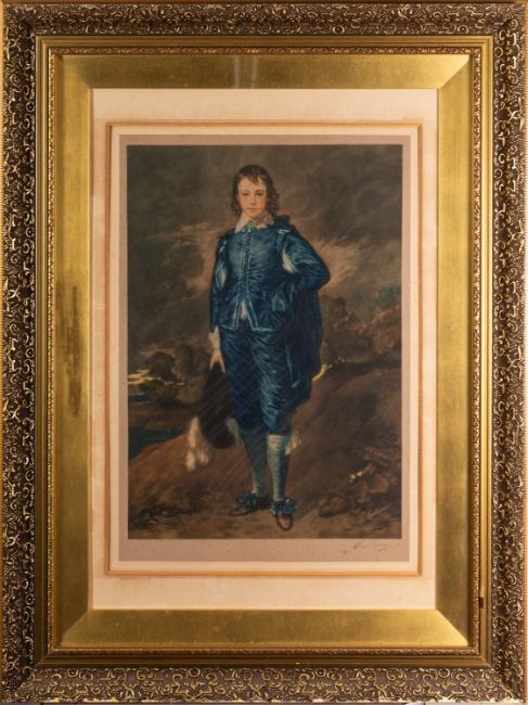 Albert Galain (British, 19th/20th Century) after Thomas Gainsborough - Blue Boy - Coloured mezzotint - 60 x 40cm, 93 x 69.5cm framed.- Together with two Mezzotints by Thomas G Appelton after George Morland, each 37 x 29.5cm, 51.5 x 42.5cm framed, a reproduction after Sir Peter Lely and another after Thomas Gainsborough. (5)