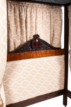 A 19th Century and later mahogany half tester bed. The moulded cornice with floral drapes above a headboard conforming upholstery on straight legs, the base being ten later pine slats, the foot having a shaped top flanked by barley twist supports and knop turned feet all to wooden castors, 212cm high, 143cm wide, 210cm deep.