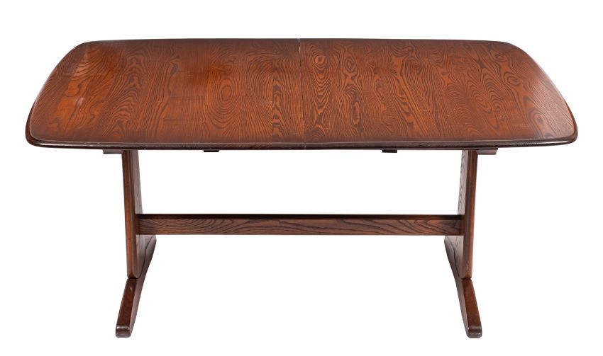 An Ercol dark elm extending dining table and six chairs en suite, circa 1960s / 1970s; the table with two additional leaves, with tapered end supports united by a stretcher, above trestles, 74cm high, the top 160cm long closed, the leaves adding another 30cm each, 102cm wide; The chairs including twin elbow chairs, all with openwork carved swans to the back splats, 100cm high