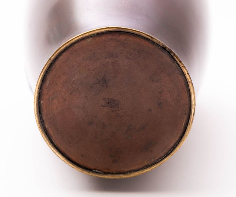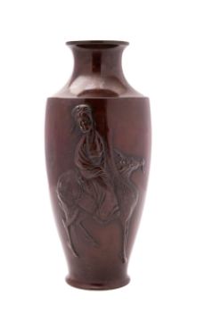 A Japanese bronze vase, Meiji period decorated in relief with a lady riding a mythical Kirin, indistinctly signed Ippei saku, 28cm.