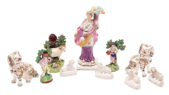 A mixed lot of Staffordshire pearlware and other pottery figures, 19th century comprising a figure of Plenty holding a large cornucopia of fruit, 26cm; three Walton-style bocage figures, 13 and 16cm; a pair of spaniels with separately moulded front legs and sponged grey markings, 13cm; and four small models of sheep 7cm [some damage, one spaniel with loss to nose, some flaking] 10.
