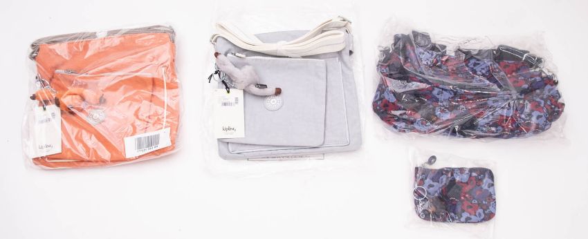 Kipling. A group of three handbags and a purse, including a 'Neila' in 'Fields Floral B' with match 'Creativity S', together with two 'Rennur' in the colours 'Active Grey Bl' and 'Sweet Orange C' . Items within original packaging with tags and unused. (4)