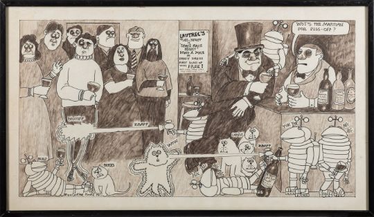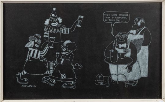 Brian Carter (British, 1937 - 2015) - Four cartoons of drinking interest - Felt tip and crayon on paper - 31 x 55cm, 33.5 x 57cm framed and smaller - All signed and dated.76. Brian carter wrote a column called 'Carter's Country' for the local Torquay Herald Express
