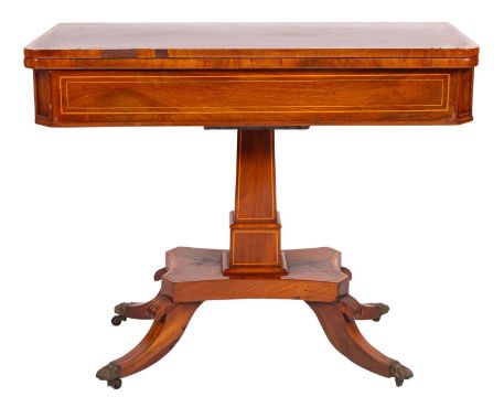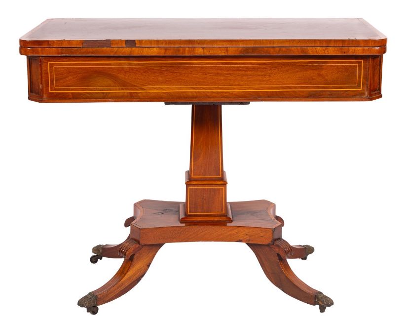 A late Regency mahogany and inlaid rectangular card table, crossbanded in satinwood, bordered with boxwood and ebony lines, the baize lined hinged top with fan spandrels, on a square section column, quatrefoil platform with canted angles and quadruped splayed legs, terminating in brass lions claw cappings and castors, 90cm width, 74cm height, 44cm depth.