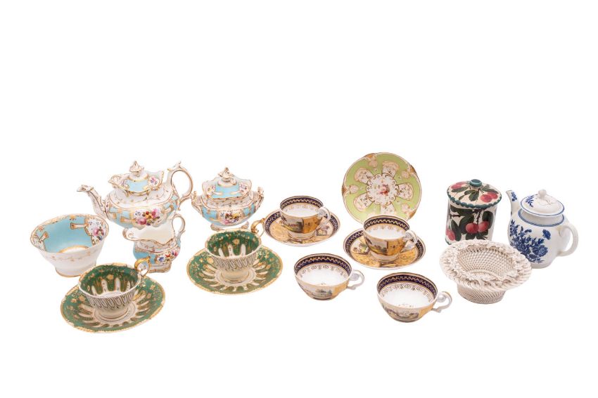A mixed lot of English and Irish ceramics, late 18th century and later including a Worcester First Period blue and white teapot and cover; a Belleek flower encrusted basket; a Wemyss jam pot and cover; and a group of mid 19th century tea wares [damages] a lot.
